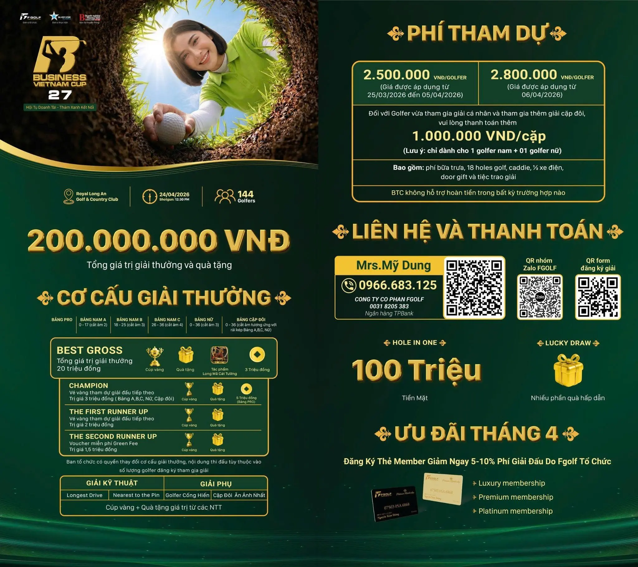 Tiếp nối sức nóng và dư âm thành công từ Giải Mùa Xuân, FGOLF chính thức công bố thông tin về sự kiện tiếp theo sẽ được ra mắt trong thời gian tới: Giải đấu Business Vietnam Cup 27. Khởi tranh tại một trong những sân golf quy mô và đẳng cấp hàng đầu khu vực phía Nam hiện nay – Sân Royal Long An Golf and Country Club, Business Vietnam Cup 27 hứa hẹn sẽ mang đến một quy mô hoành tráng hơn, chuyên nghiệp hơn và tiếp tục là cầu nối vững chắc để các doanh nhân mở rộng mạng lưới quan hệ, hợp tác cùng phát triển.